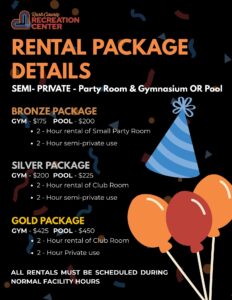 Party rentals include a dedicated room for food, gifts, and gathering, along with access to either the gymnasium or pool, depending on the package selected.