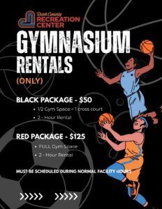 Rentals are available in half-court or full-gym options and must be scheduled during normal facility operating hours.